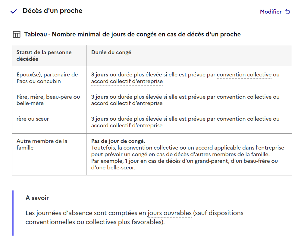 • Vous devez remettre un justificatif (acte de décès) à votre employeur.